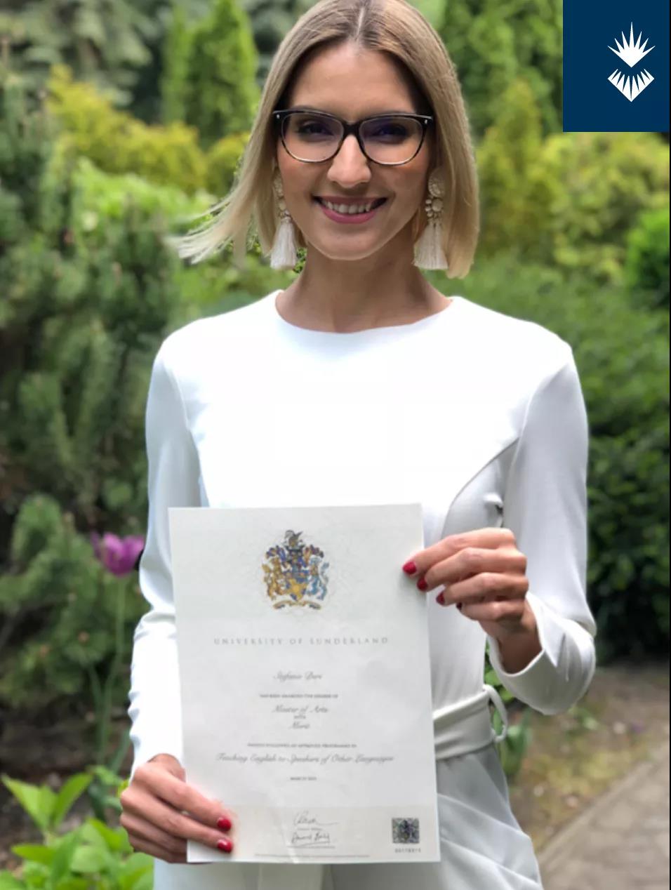 在听说英国桑德兰大学设置有远程教学课程后,Stefanie Deri就知道这正是她想要的——她喜欢课程的持续时间、灵活性和费用。毕业后,斯蒂芬妮变得更加自信,她现在有一份电视新闻主持人的日常工作,但是教学是她的激情所在,所以在业余时间她仍在兼职教学,并在家乡布达佩斯的英语夏令营获得了一份暑期工作。
