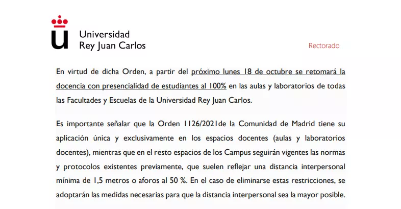 胡安卡洛斯国王大学本科各专业将于10月18日周一开始,恢复100%线下授课模式,各大教学活动也将恢复线下。